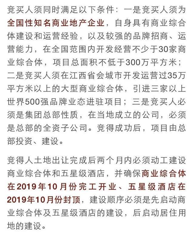 競(jìng)買人競(jìng)得成功后,須按照規(guī)劃條件要求,在項(xiàng)目地塊內(nèi)統(tǒng)一規(guī)劃、統(tǒng)一建設(shè)商業(yè)綜合體和五星級(jí)酒店。其中:商業(yè)綜合體的功能定位為大型百貨、超級(jí)市場(chǎng)、特色商業(yè)街區(qū)、人文展示街區(qū)、特色餐飲、國(guó)際電影院線等,產(chǎn)權(quán)面積不少于28000平方米,且100%自持;五星級(jí)酒店產(chǎn)權(quán)面積不少于28000平方米,且100%自持。