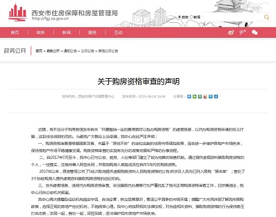 繼陜西住建廳發(fā)布《進一步加強商品房預售管理工作》之后,6月4日下午,西安市房產交易管理中心發(fā)布《關于購房資格審查的聲明》(以下簡稱“聲明”),強調購房資格審查,通過提供虛假資料騙取購房資格的個人,取消購房人家庭成員在西安市5年內的購房資格。